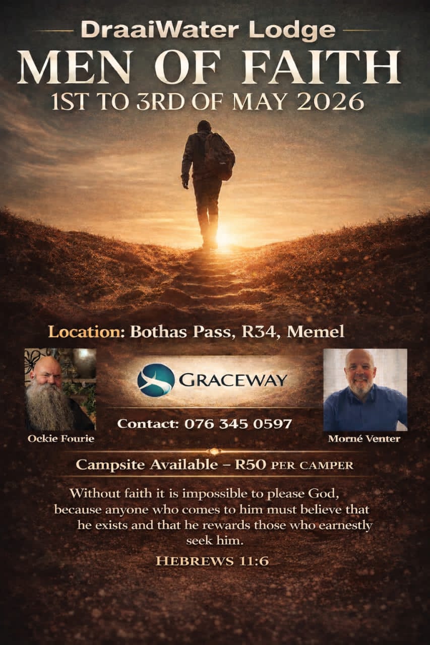 Men Of Faith Weekend with Ockie Fourie and Morne Venter. Come and join us for a men’s weekend of Faith at the Draaiwater Lodge between Memel and Newcastle on the R34. Camping sites available at R50 per day.